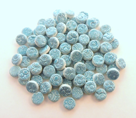 The embossed mini circle tiles come in Blue, Dark Gold, Neon Orange, Turquoise and Yellow. They go great in mixed media projects (with stained glass, tesserae, glass tiles, etc..) A great addition to any project..By themselves are great too.. These have been made out of wet clay then painted, glazed, and fired in a kiln twice which makes them strong and waterproof. They are flat on the back for easy attachment to any project. Each individual tile is 1/2 inch (12 mm) in diameter and 3/16 inch (4.5mm) thick, please refer to picture as a guide for the size. Return to Previous Page From Embossed Mini Circle Tiles Return to Making Mosaics Home Page |