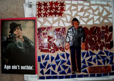 My 30 year old son loves the Rocky movies, and he asked me to do a mosaic of Rocky. I did not want to do it, thinking maybe it was "beneath" me, haha. After much thought, and advice from friends, I did this one for his birthday. I used a Rocky figure which I made out of clay, and red glass stars, since Rocky is patriotic! I got a lot of joy doing this for him. Click here to read or post comments Return to Making Mosaics Home Page |